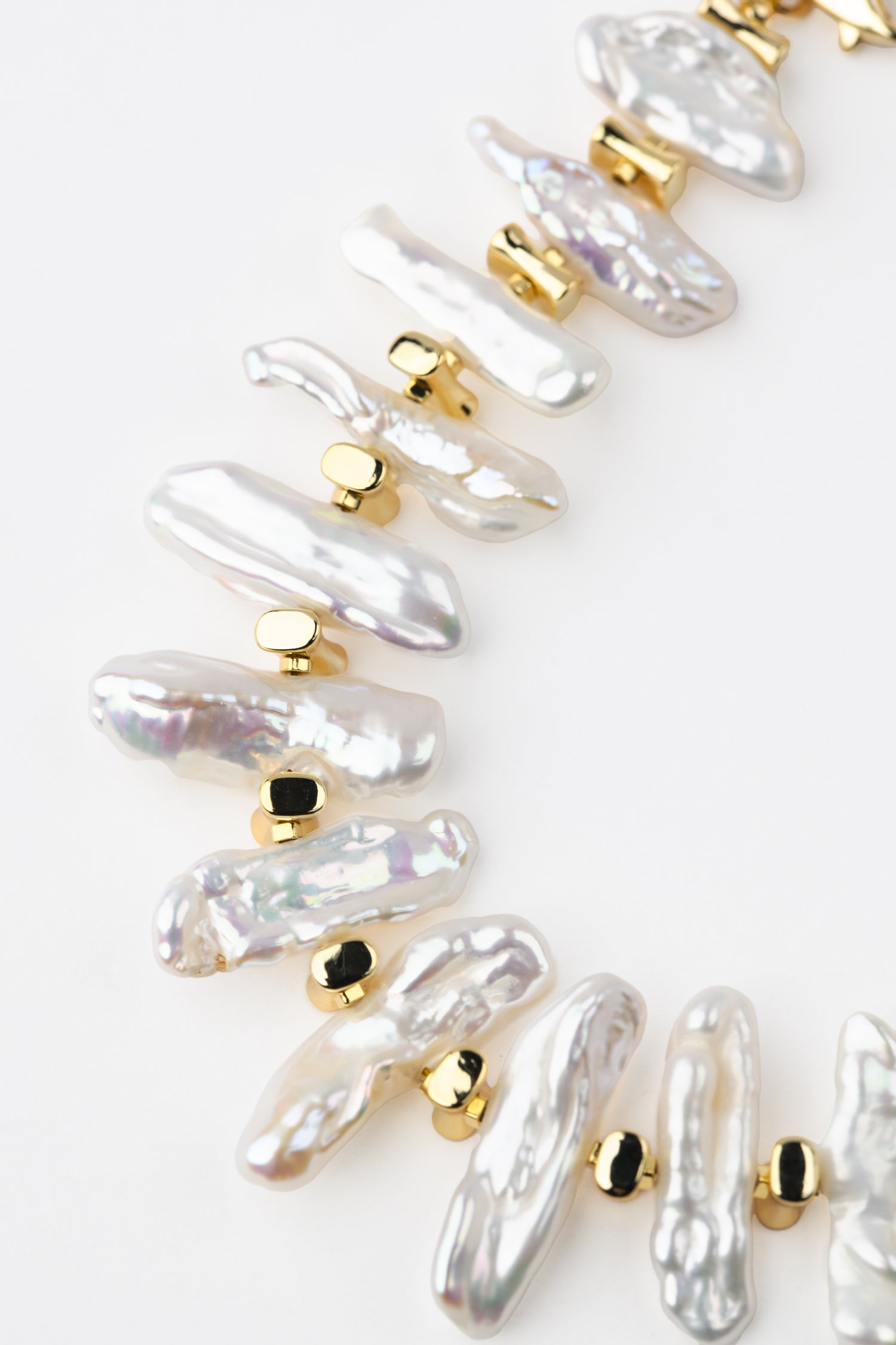 - A dramatic cascade of baroque pearls strung with 14K gold-plated accents, this sculptural bracelet exudes bold artistry and radiant charm.