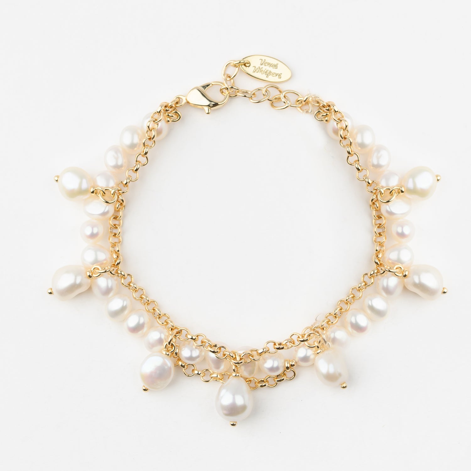 - Floating button pearls delicately cascade from gold-plated strands, creating a bracelet full of graceful movement and layered elegance.
