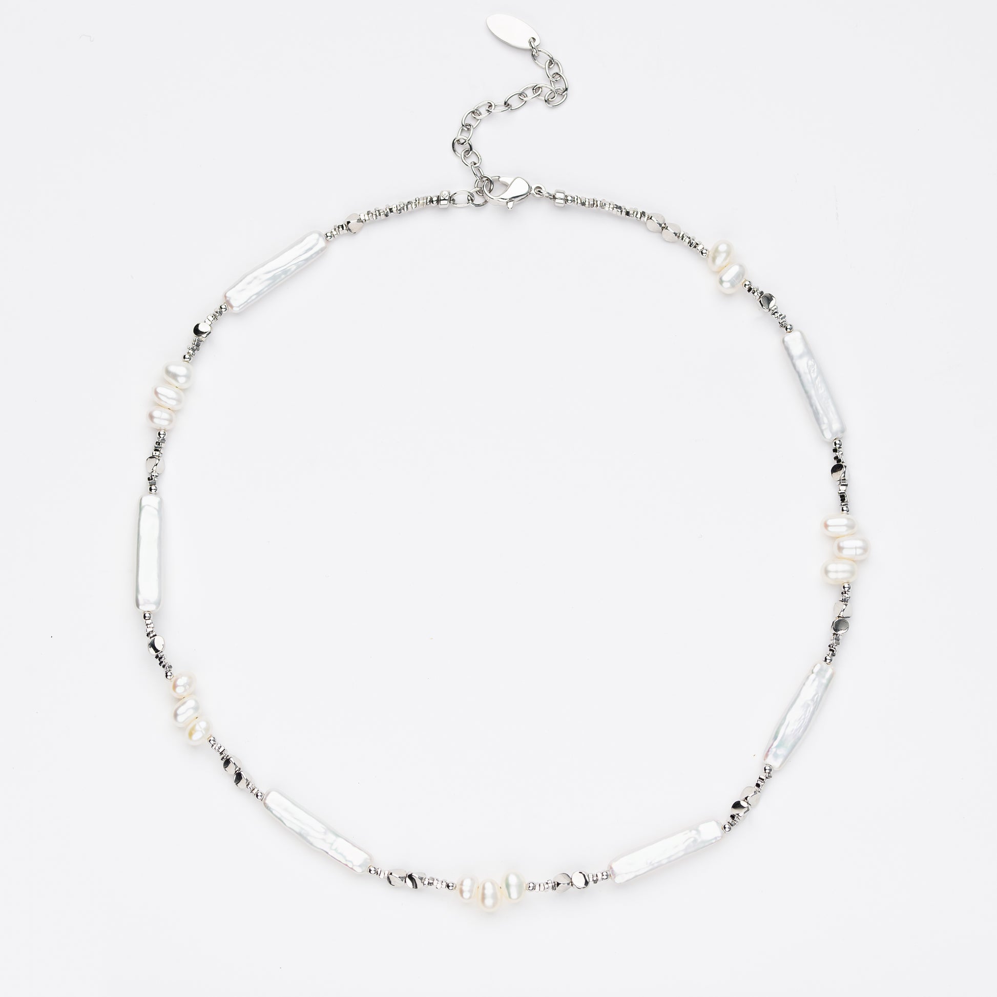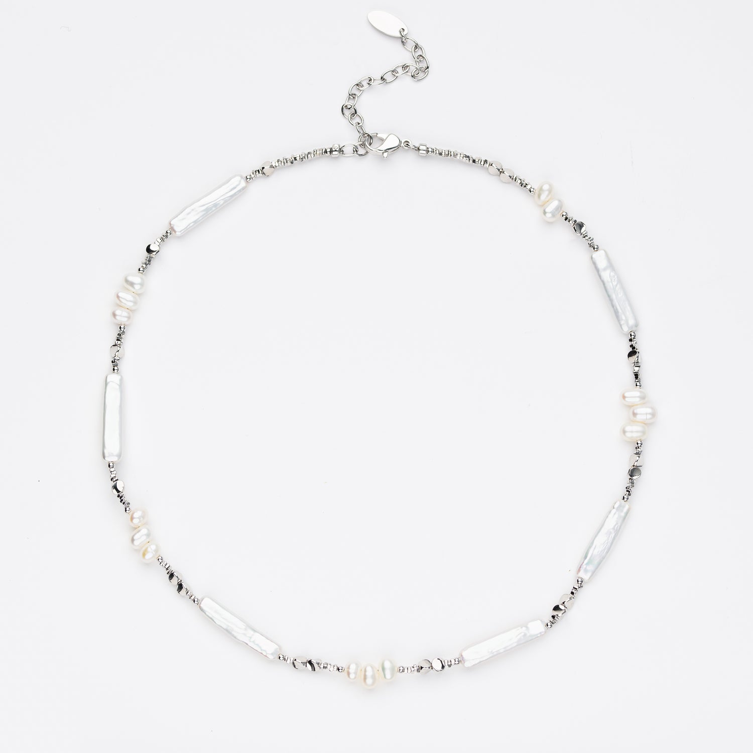 A refined mix of natural elongated baroque pearls and dainty accents flows along a platinum gold-plated strand, exuding modern grace with sculptural allure.