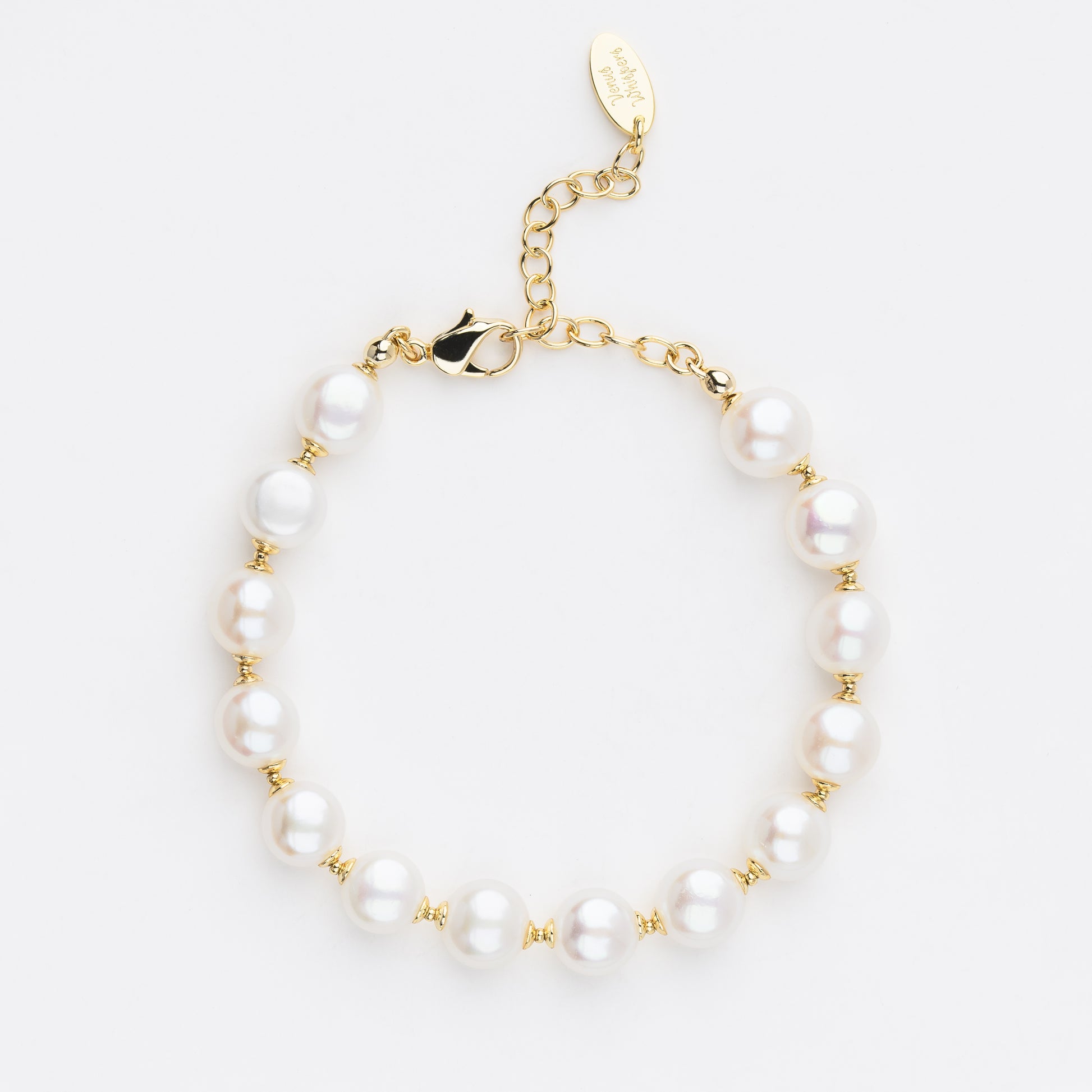 - A classic strand of luminous button pearls, evenly spaced for balance and refinement, brings understated elegance to any wrist with timeless allure.