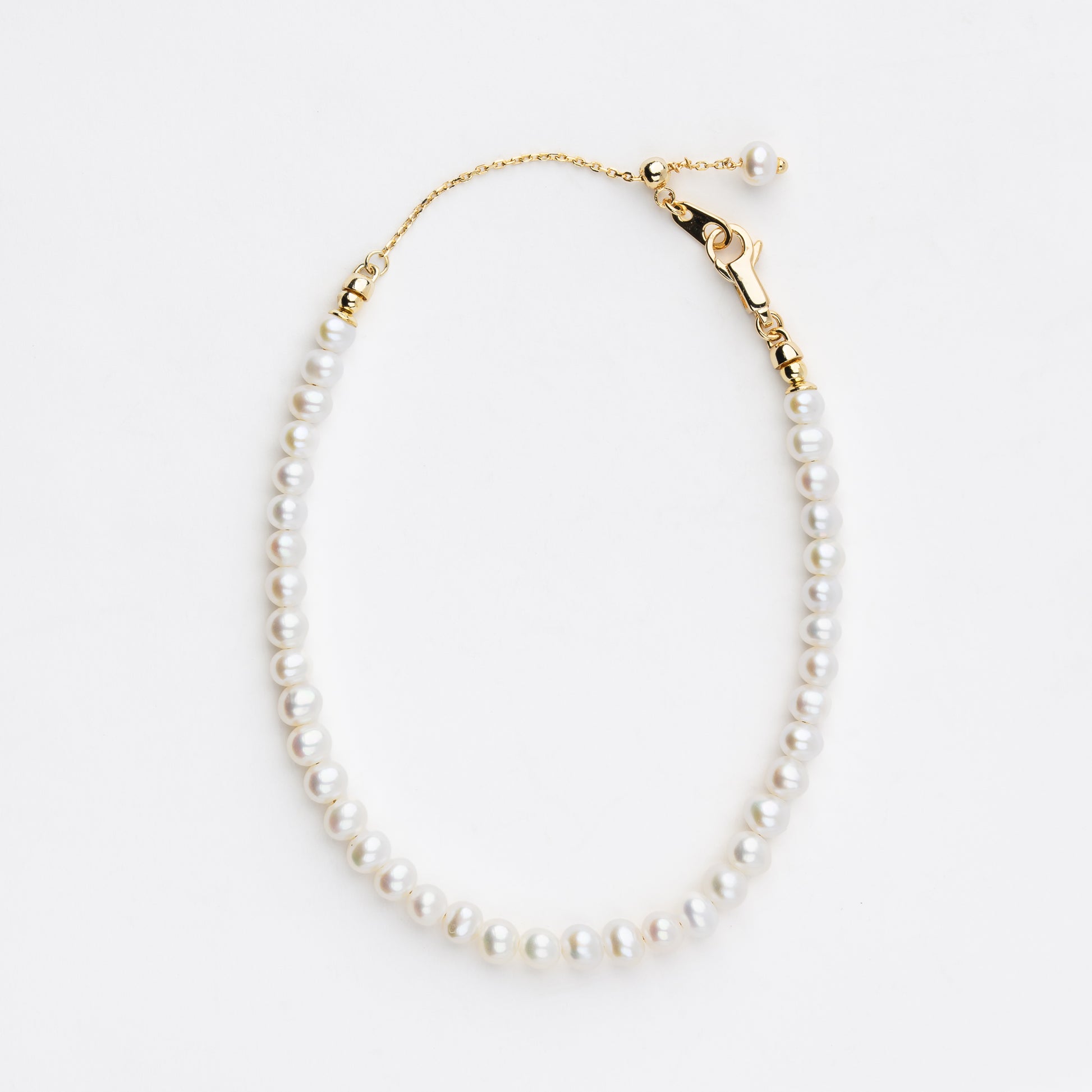 A timeless strand of luminous rice pearls wraps delicately around the wrist, exuding refined simplicity with every iridescent glimmer.