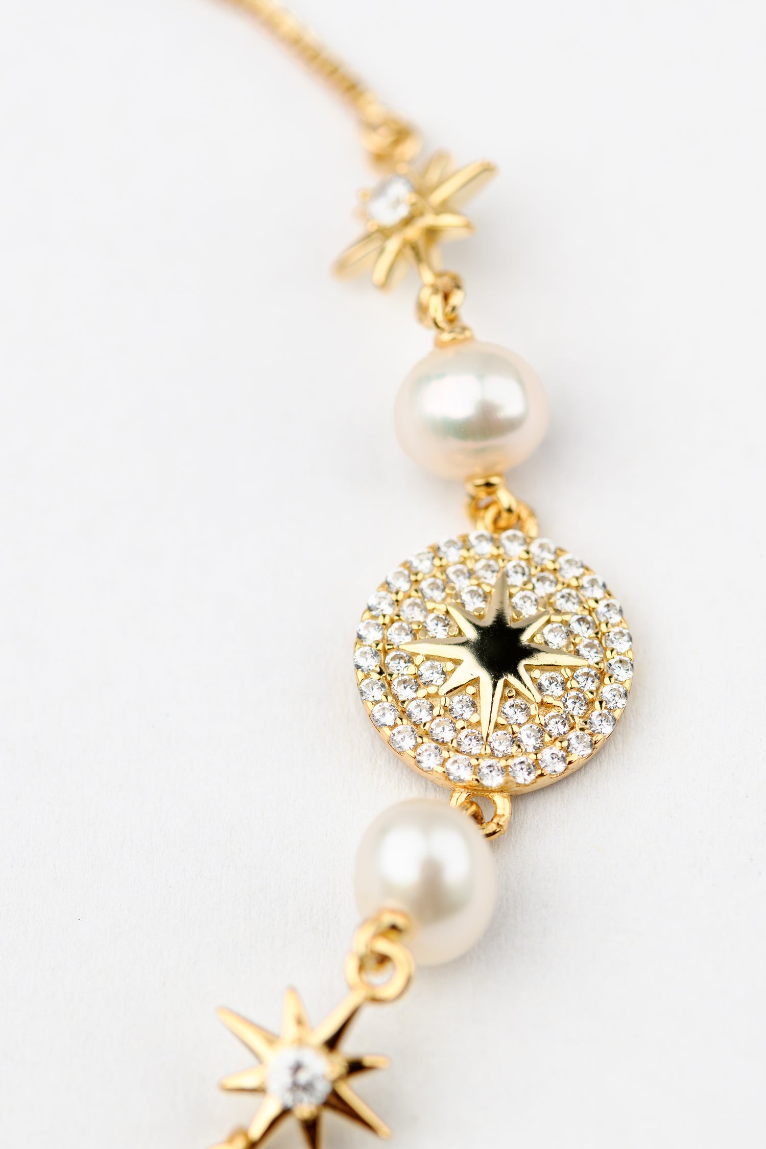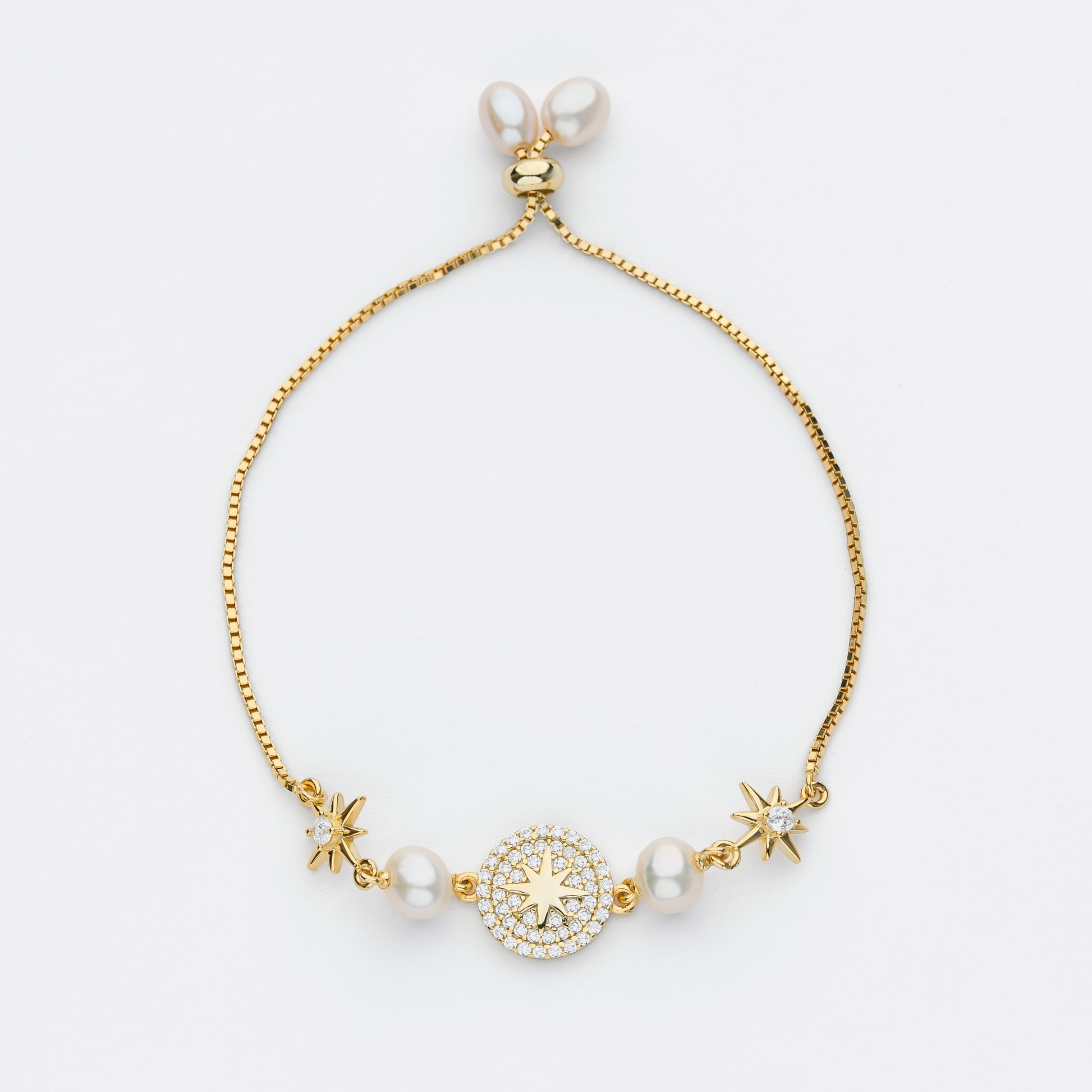 - Celestial motifs and glimmering stones frame radiant rice pearls on this adjustable bracelet, blending modern charm with cosmic elegance in 14K gold plating.