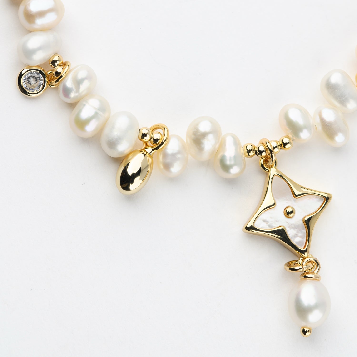 A whimsical constellation of rice pearls, 14K gold-plated details, and engraved gemstone accents forms a delicate strand, anchored by a radiant charm that captures the poetry of starlight.