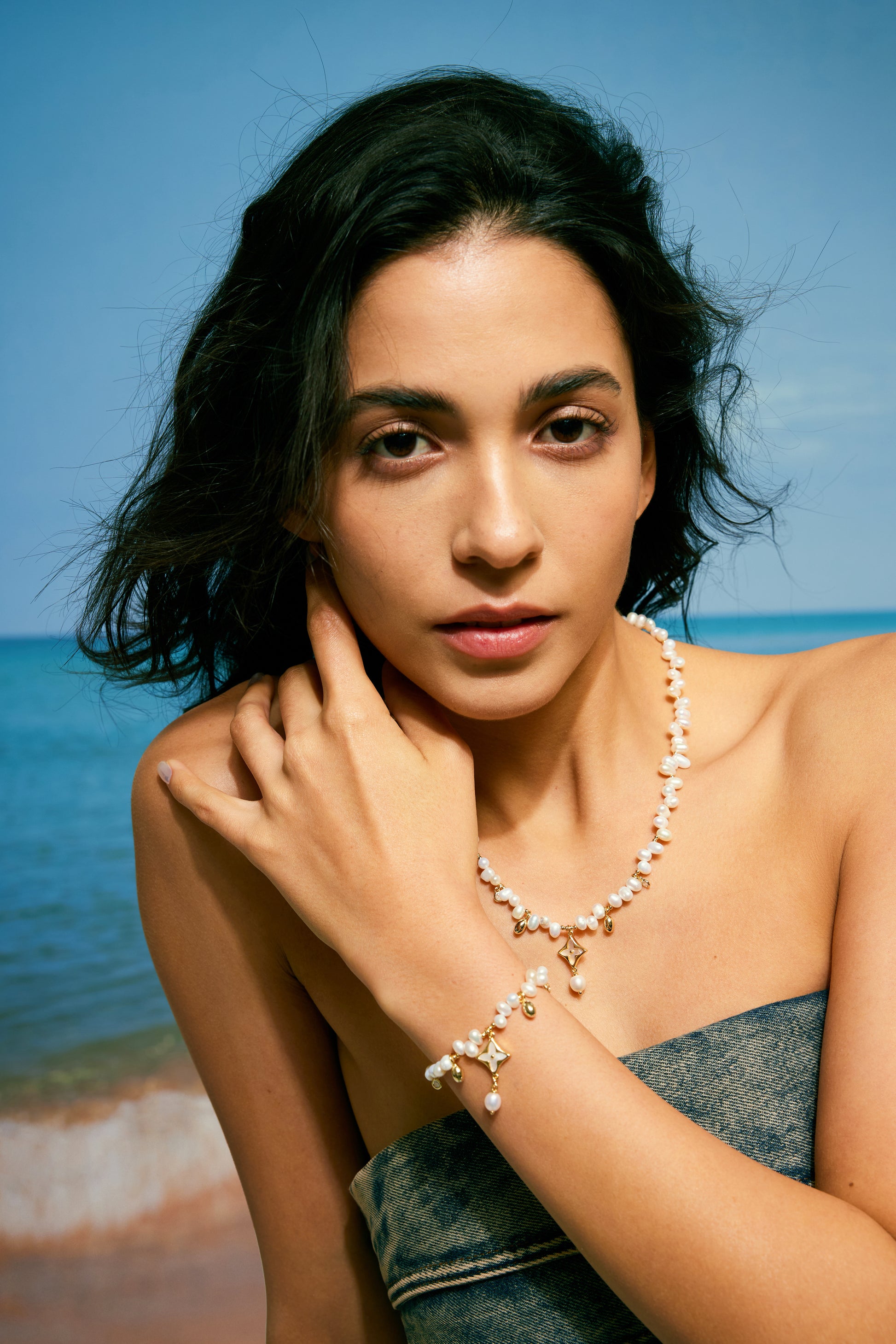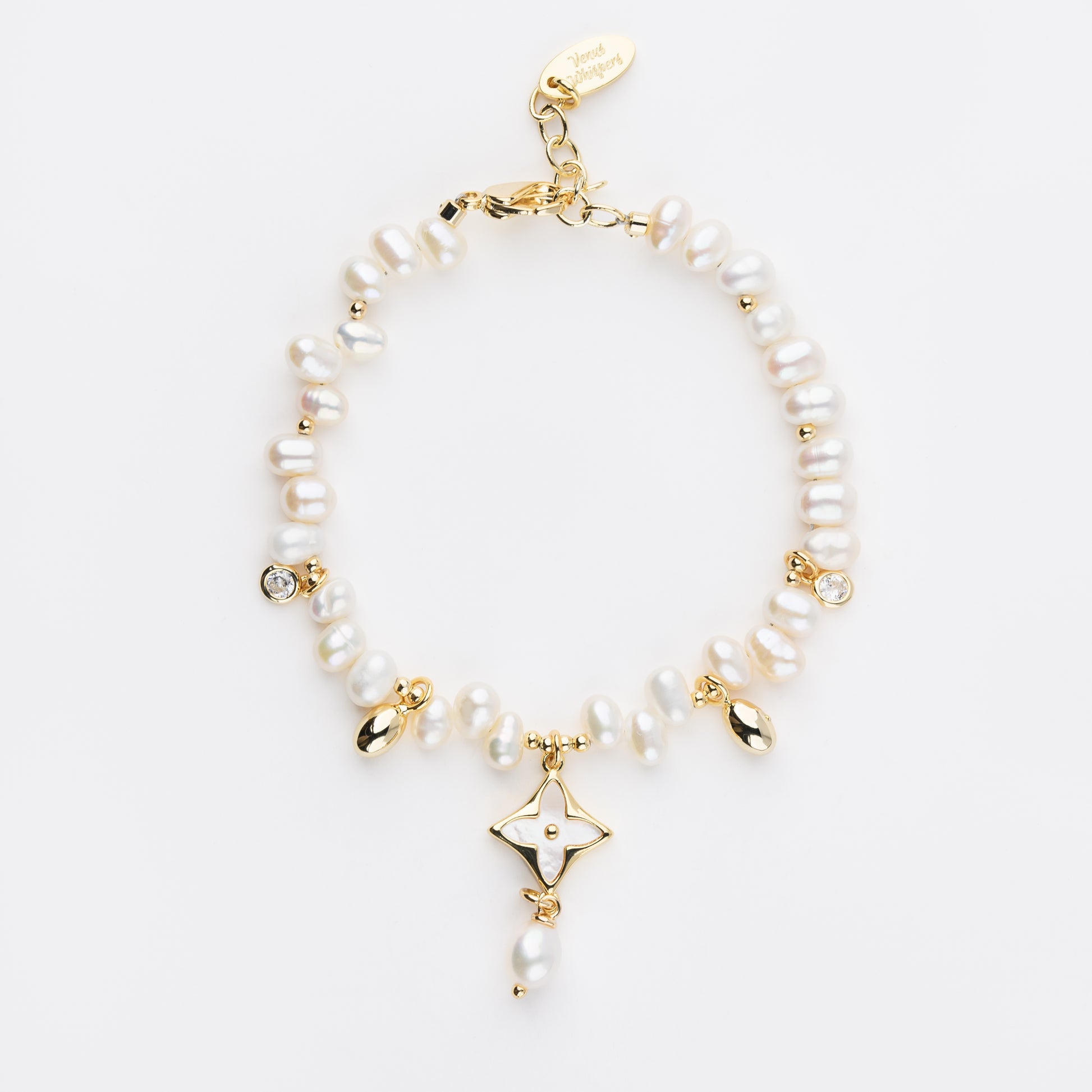 - A whimsical constellation of rice pearls, 14K gold-plated details, and engraved gemstone accents forms a delicate strand, anchored by a radiant charm that captures the poetry of starlight.