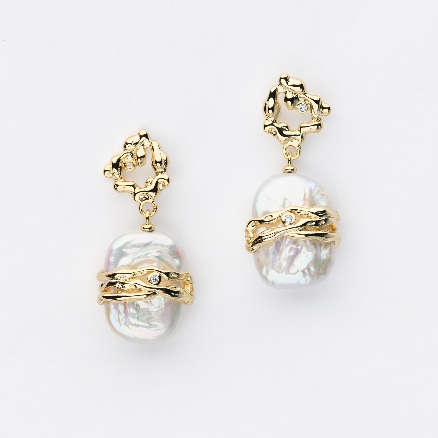 - Bold and refined, this sculptural earring showcases a luminous baroque pearl embraced by 14K gold-plated curves and sparkling accents.