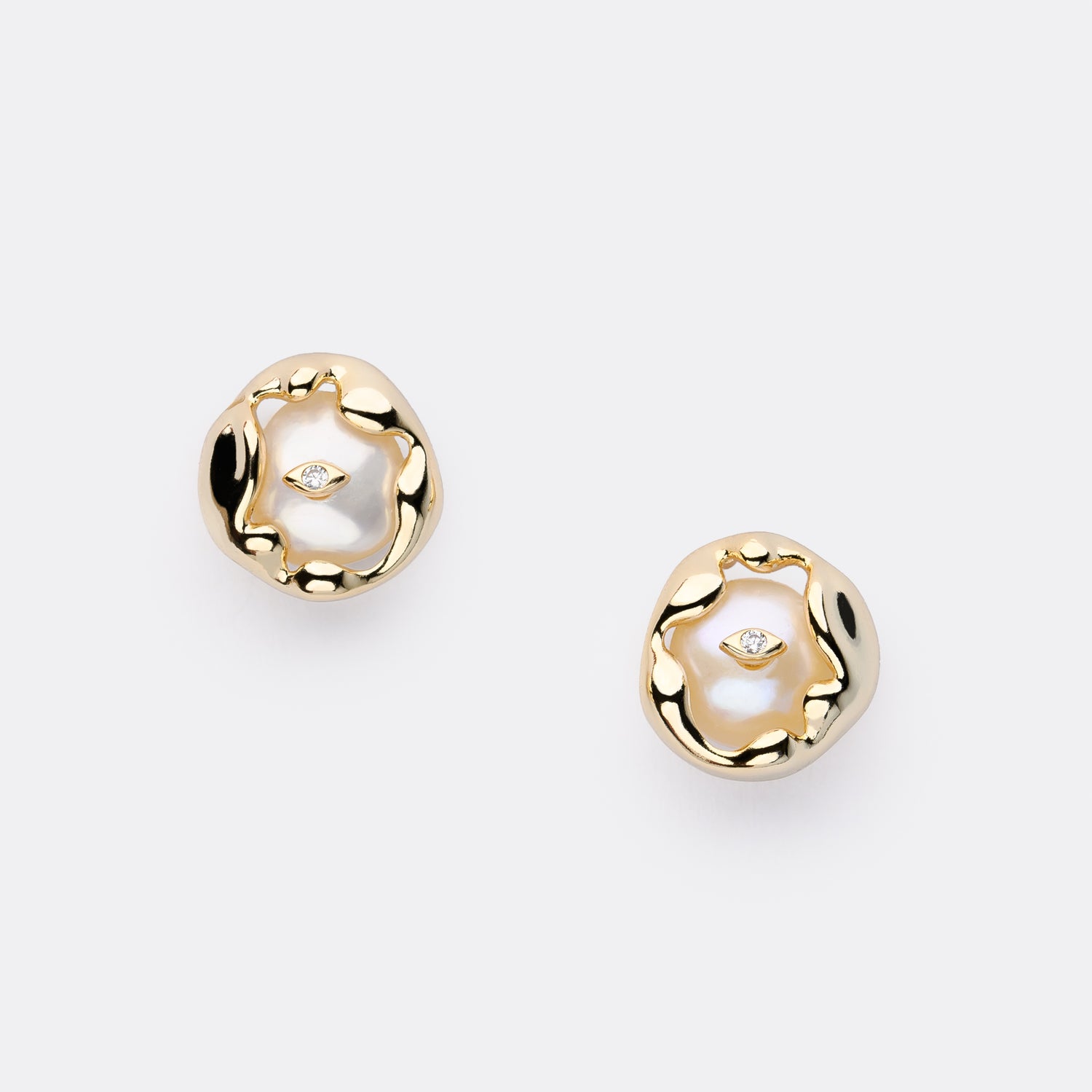 A lustrous pair of button pearls nestles within sculptural 14K gold-plated frames, each adorned with a delicate engraved gem that glimmers like a hidden spark—effortlessly refined with a touch of artistry.