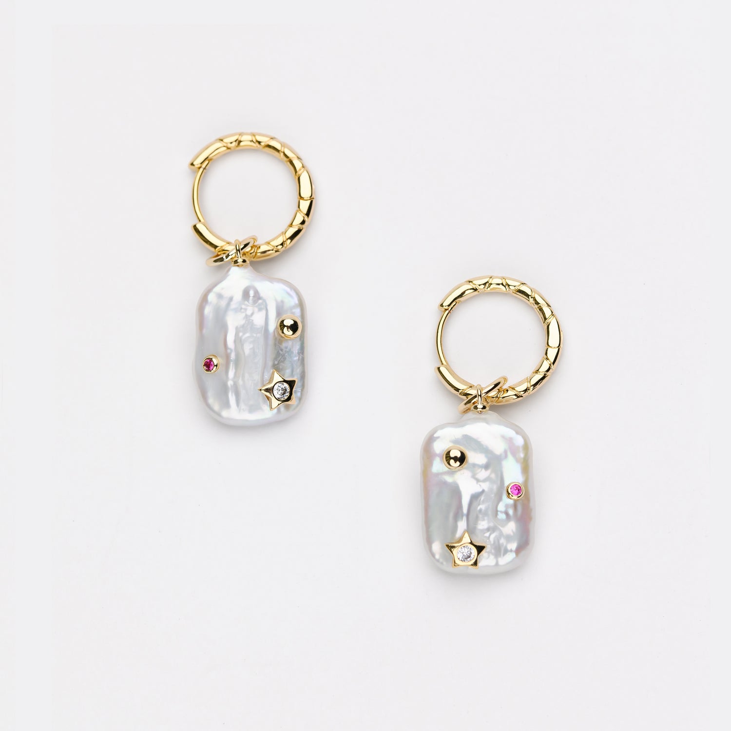 - These luminous Baroque pearl earrings feature 14K gold-plated huggie hoops and are adorned with sculpted star-set gemstones, blending cosmic charm with sculptural elegance.
