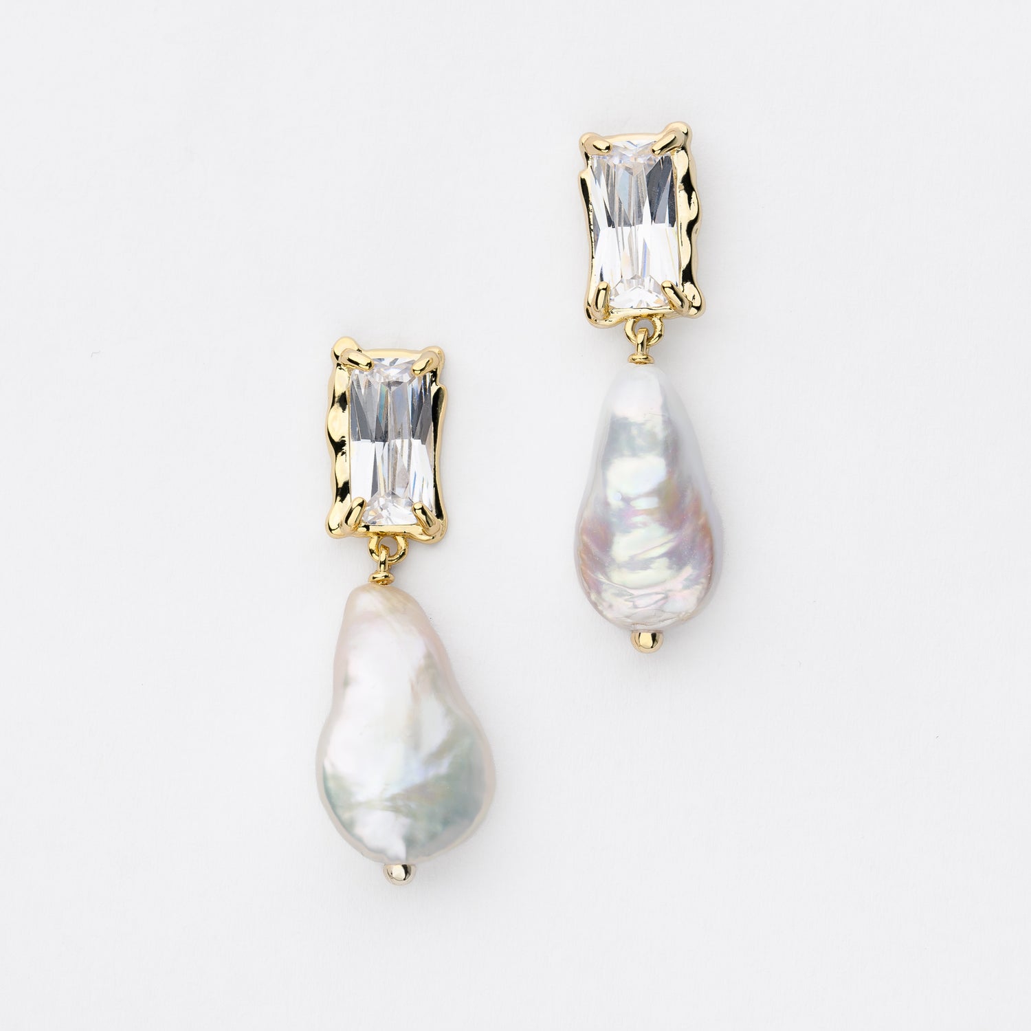 A luminous pairing of baroque pearls and emerald-cut gemstones, these 14K gold-plated earrings exude a refined glamour with a bold, artistic edge.