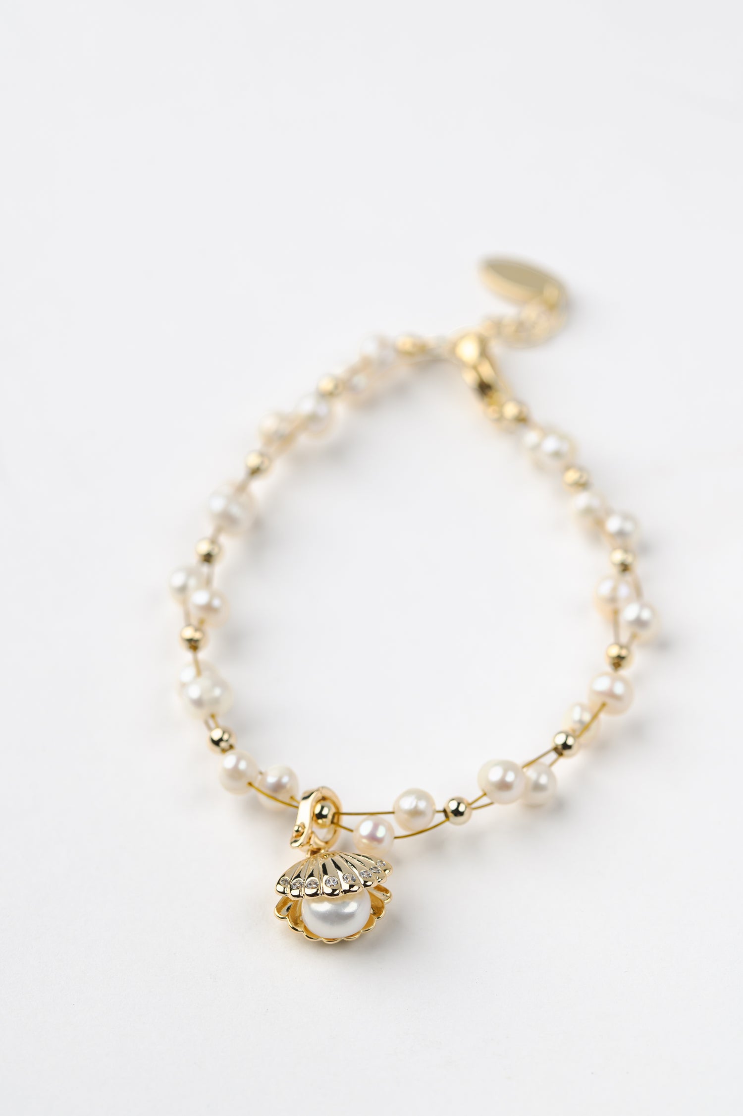 - Dainty rice pearls dance along a sleek wire, anchored by a sculpted seashell charm that evokes sunlit shores and timeless elegance.