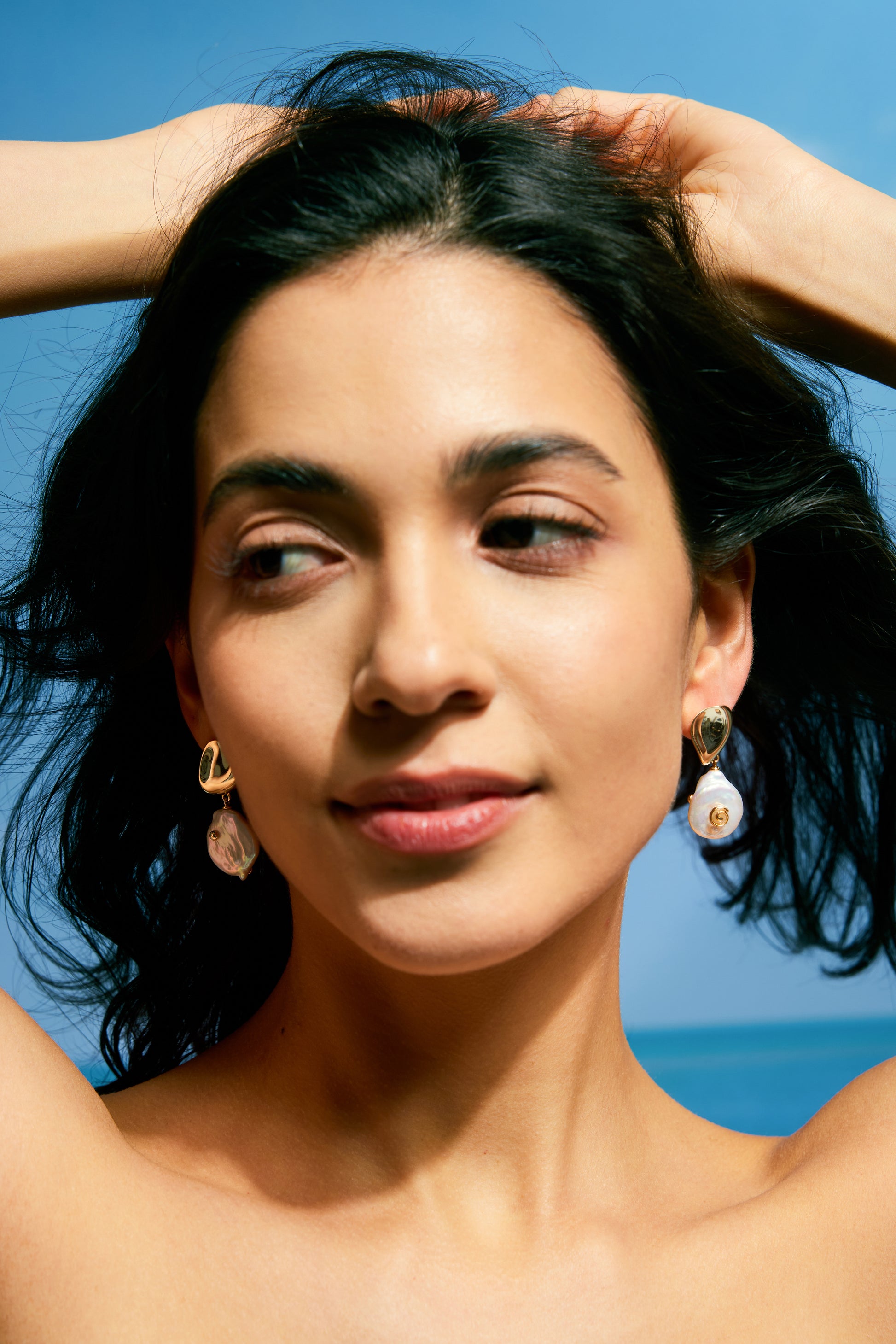 These sculptural drop earrings feature bold baroque pearls suspended from high-shine 14K gold-plated studs, exuding a refined, artistic edge.