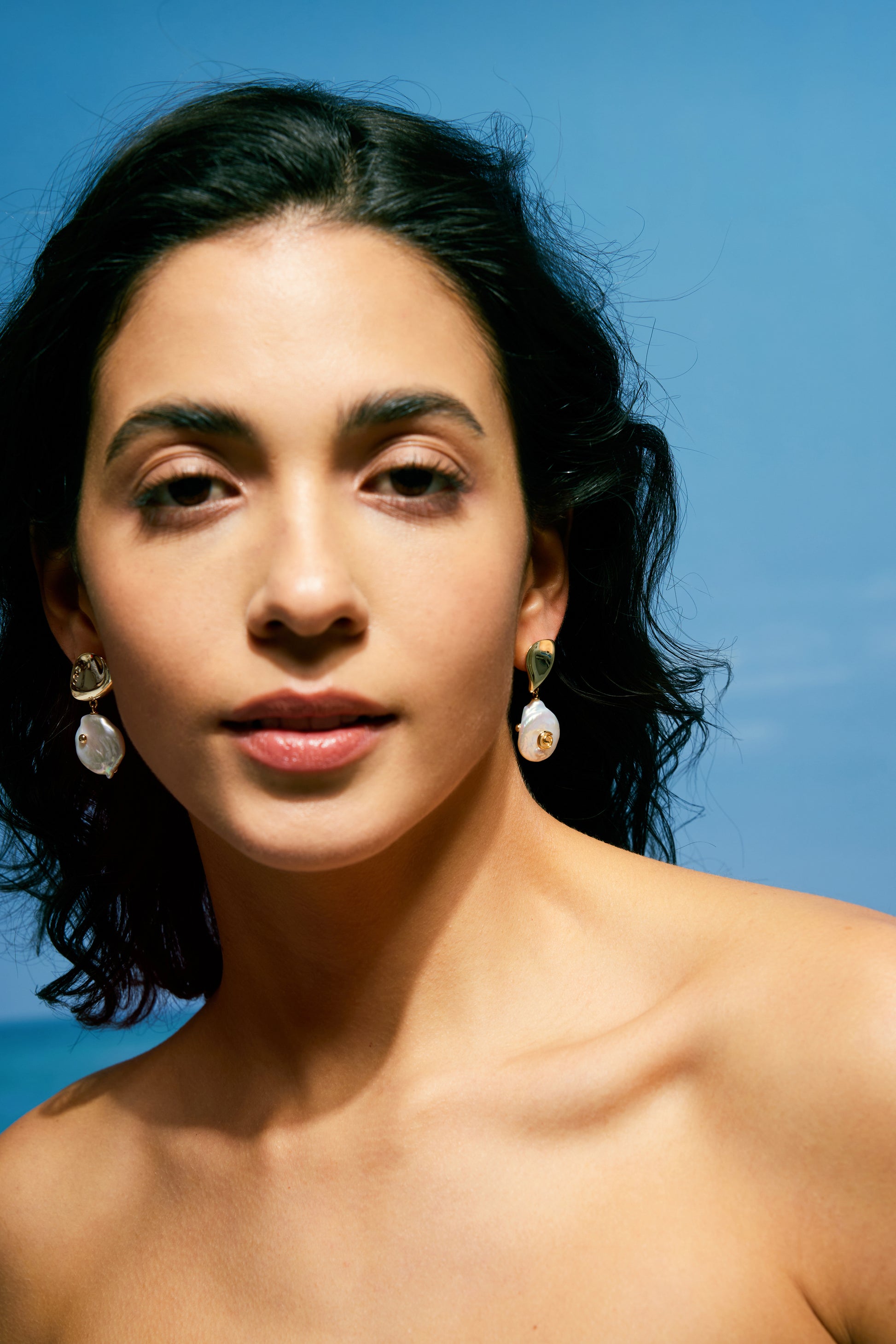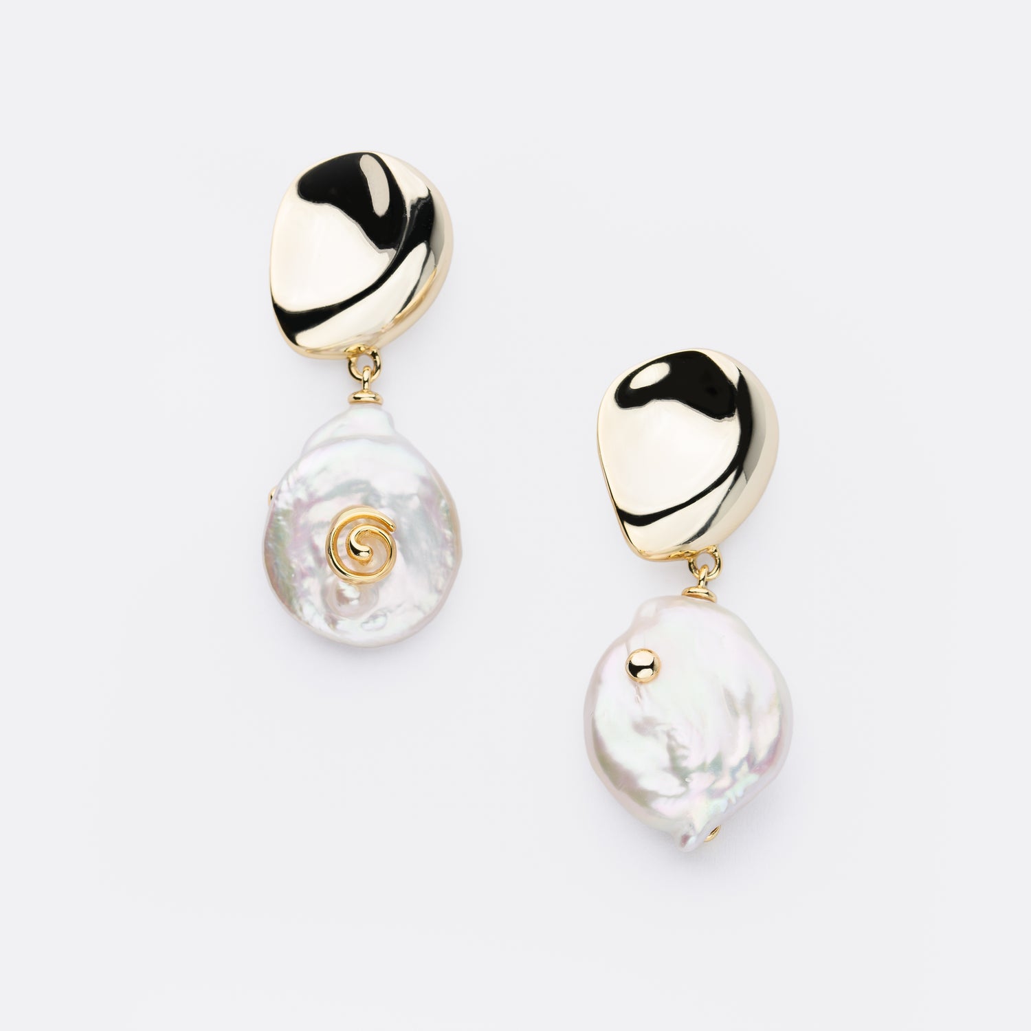 - These sculptural drop earrings feature bold baroque pearls suspended from high-shine 14K gold-plated studs, exuding a refined, artistic edge.
