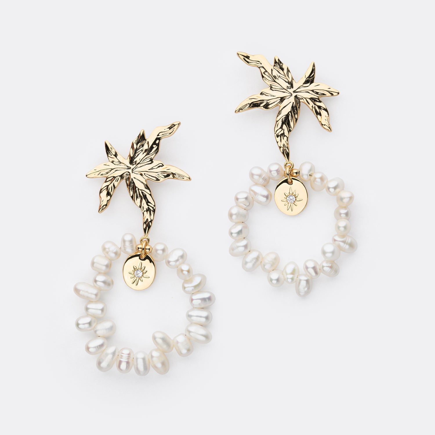 - A radiant cluster of rice pearls forms a graceful hoop, suspended beneath sculpted gold leaves and star-engraved medallions, capturing a whimsical blend of nature and artistry.