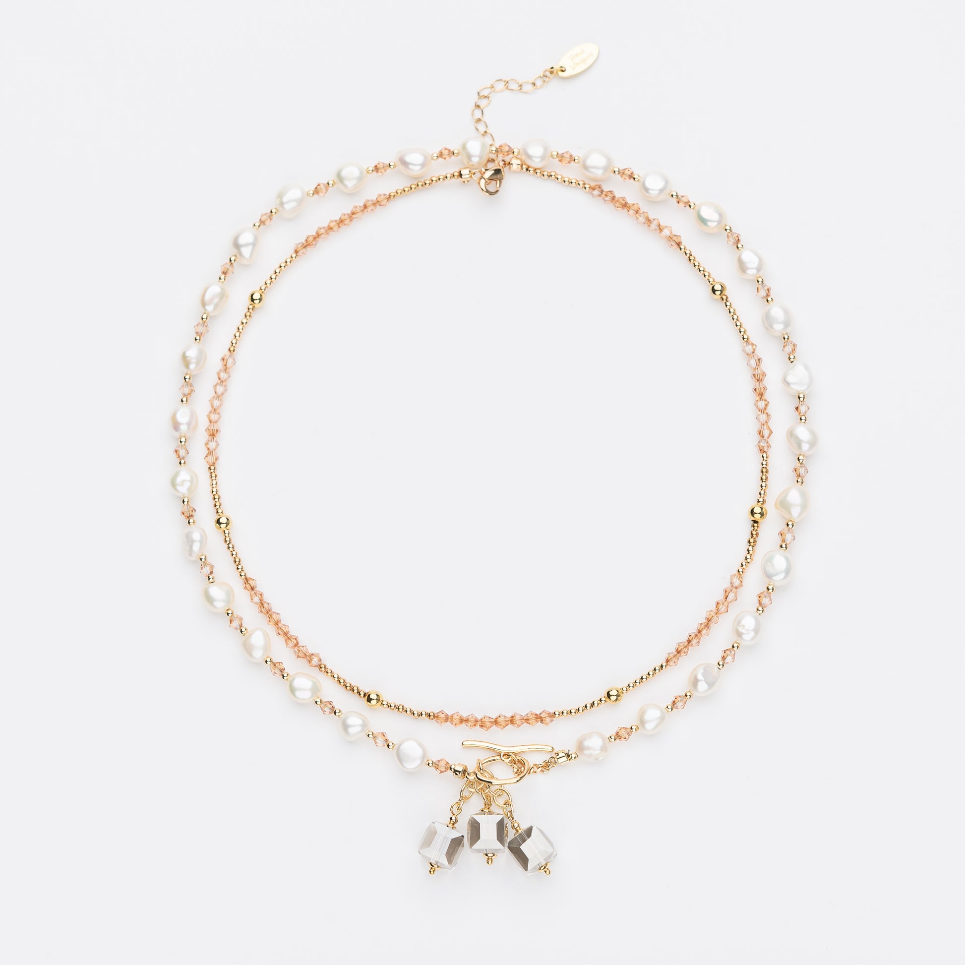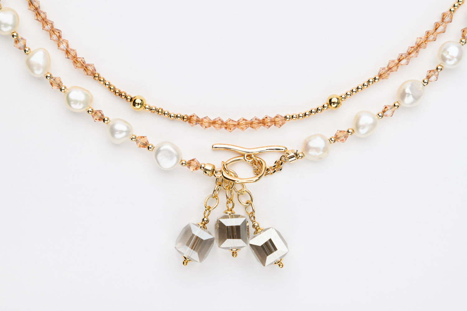 - A luminous strand of button pearls is layered with a delicate 14K gold-plated chain, finished with faceted gemstones that dance with every move.